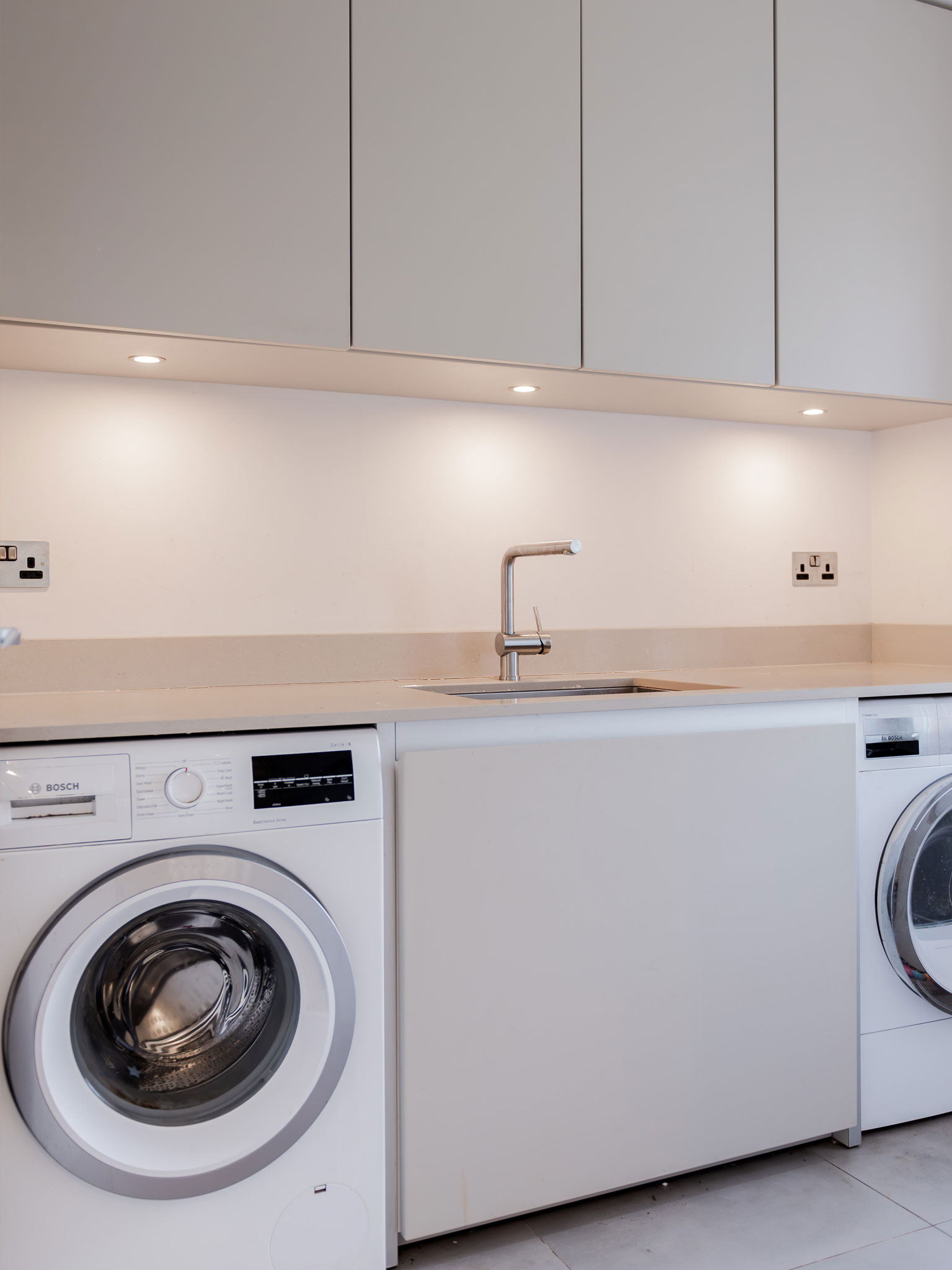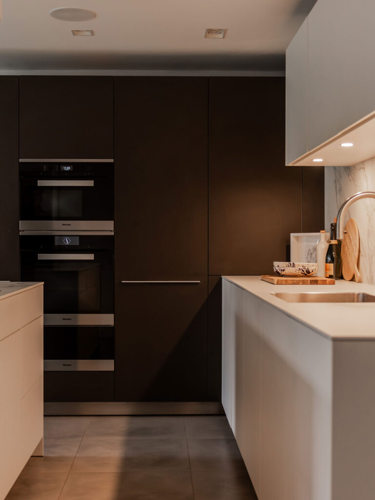 Internally, the house features a carefully considered material and lighting scheme. A Bulthaup kitchen sits at the heart of the home, surrounded by high-performance finishes including Minoli tiling and bespoke joinery. The bathrooms are equally refined, combining elegant fittings with contemporary detailing, most notably a sculptural, freestanding bathtub positioned to create a moment of calm luxury.